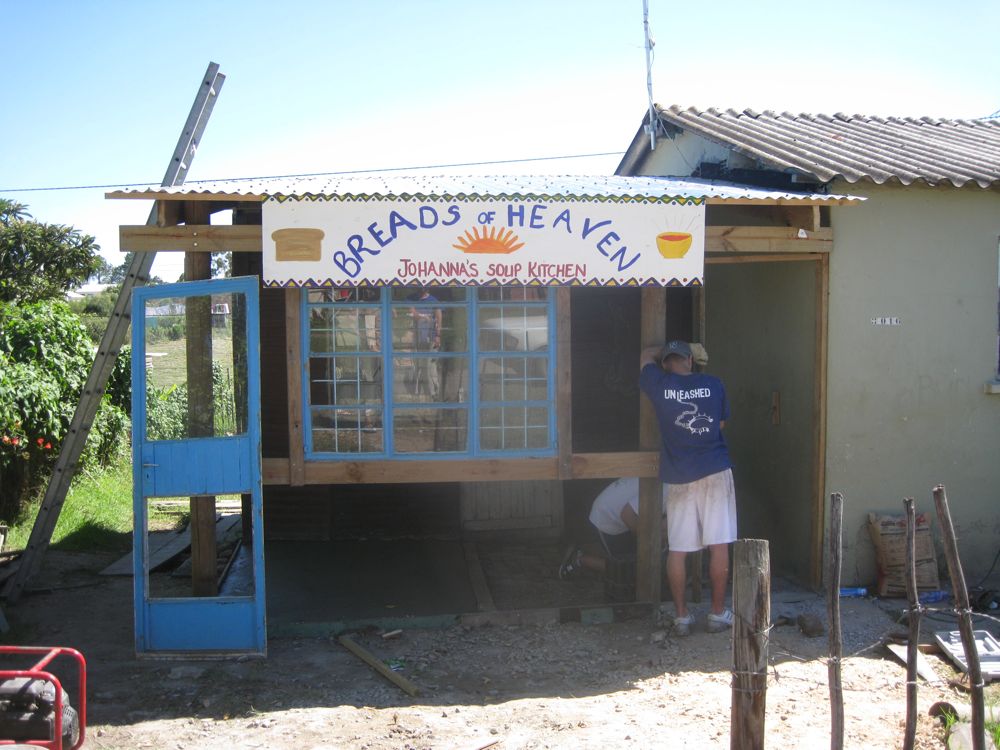 For many years now, Johanna Christian has been self-funding a soup kitchen she operates from her home to provide some of Kurland ’s neglected youth with a square meal on a regular basis. She had tried to build a structure attached to her house that would provide the kids with shelter from the rain and extreme sun. It was constructed with unsafe scrap wood and didn't yet have a roof. Here, the volunteers supplied and fitted a new roof supported by strong, properly treated beams that were cemented into the ground.